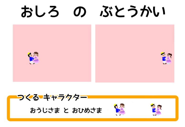 動画で紹介されている「お城の舞踏会」の作品は、もともと夏休みのプログラミング教室で宿題として出した課題を、より取り組みやすく改良したものです。
